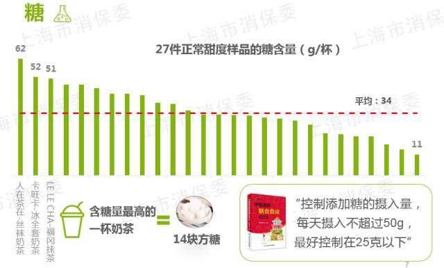 经过检测结果发现27件标称正常加糖的奶茶平均下来,每杯奶茶样品的含糖量为33g,也就是说相当于平均加入了7块左右的方糖。