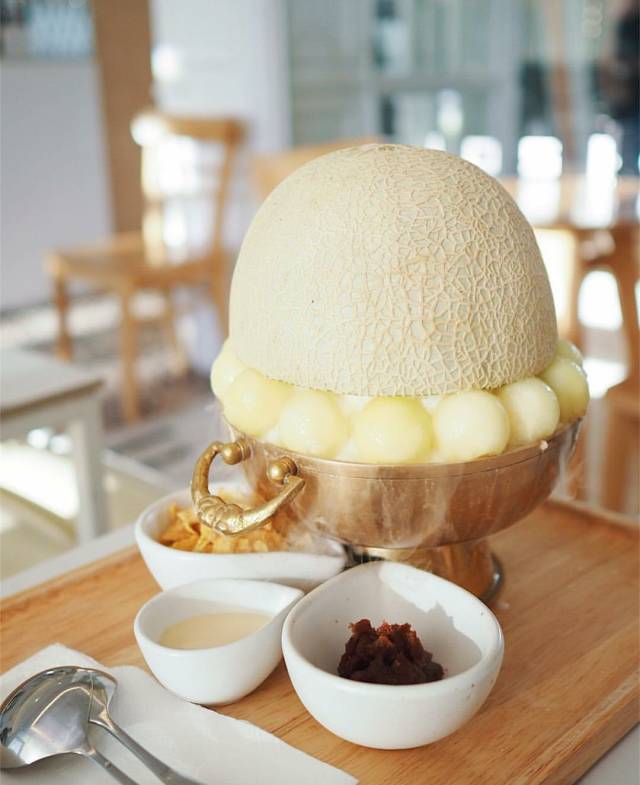 哈密瓜壳下就是一个个哈密瓜球!!!配着细软的雪冰,烟雾缭绕就像吃火锅一样!除了哈密过口味,还有芒果、草莓等等!淋上各种口味的酱料,好吃到飞起!