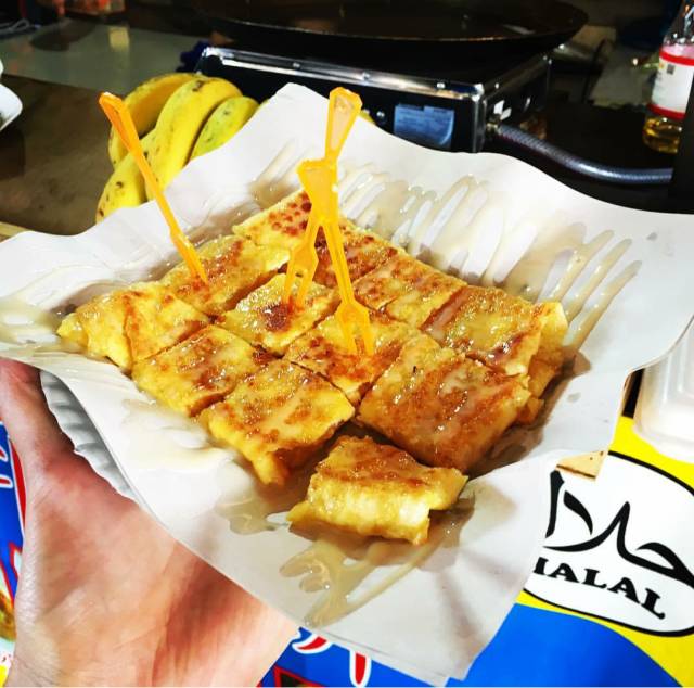 煎饼里面就是煎熟香蕉,上面还可以淋上各种酱,又甜又脆。一口咬下去,满嘴的香蕉味,香蕉爱好者们千万不要错过这个!