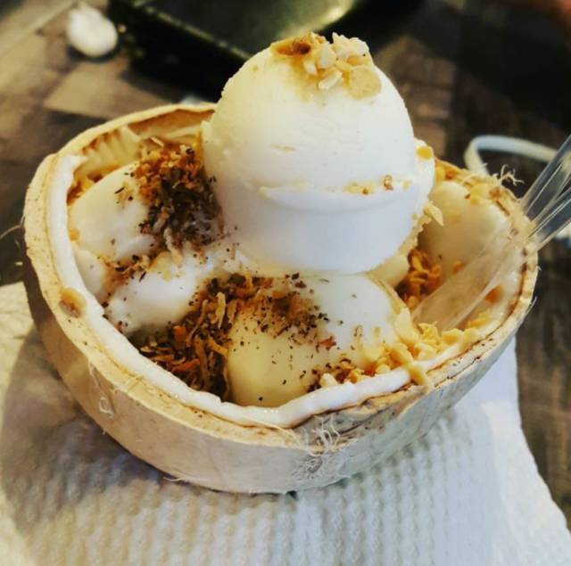 泰国水上市场必卖的椰子冰淇淋,它的欢迎度不亚于芒果糯米饭,拿着椰壳吃椰子口味的冰淇淋,很有Feel有木有!