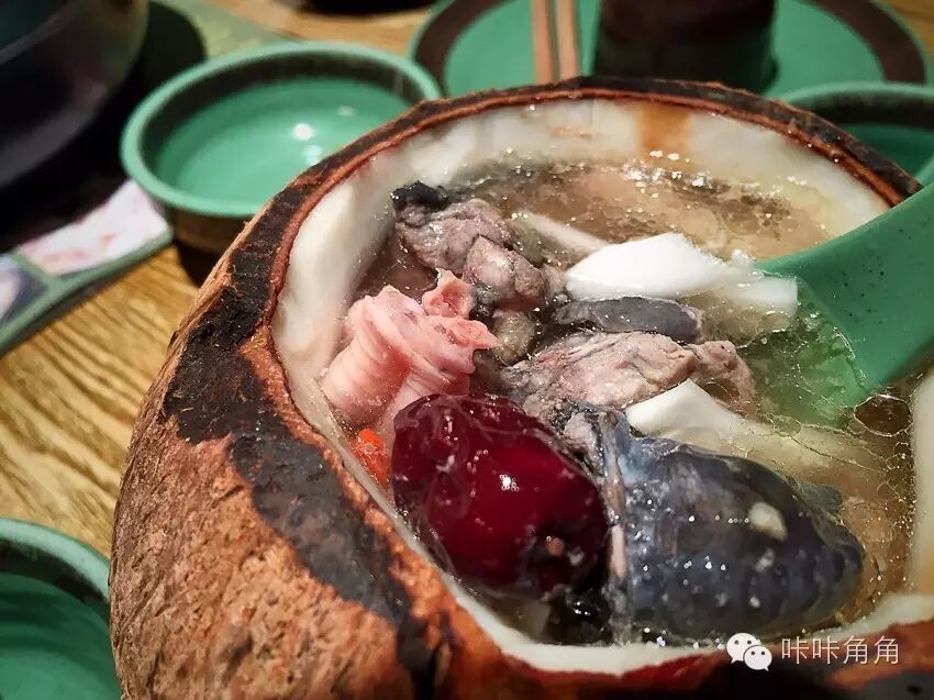 纯椰子汁和乌鸡一起在椰壳里煲制,这样的椰子盅汤汁非常清甜,入口清爽,椰香浓郁,椰肉也Q弹有嚼劲。鸡肉和椰子汁一起煲制更加嫩滑,椰子的清甜也沁入鸡肉中,别有风味。