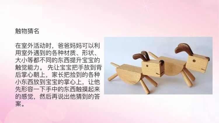 通过触物猜名的训练也可以提高小朋友这方面的能力。因为我们在室外活动的时候。可以让小朋友观察这个玩具的各种材质,形状,大小等等情况,也可以让触摸。要么记忆,要么观察,然后我们小朋友还手放在背后,掌心向上,把捡到的各种小东西小玩具放在小朋友的掌心,然后让小朋友说出手中的东西触摸起来是什么样的感觉,然后说出他所猜测的答案。