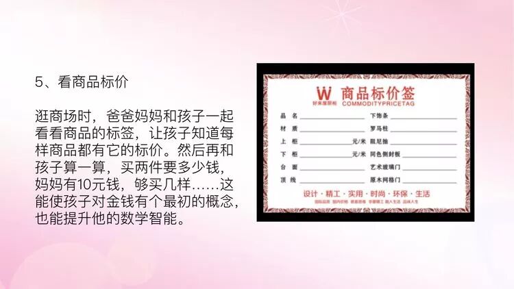 我们经常也会外出购物,那在逛商场时候爸爸妈妈跟孩子们一起看商品的标签,让小孩们知道每种商品都有它的标价,然后再跟小孩算一算,比如我买一件钱需要多少钱,买两件多少钱,但现在妈妈呢有十块钱能买几样东西,那这样可以让他建立金钱的初步的概念,也可提升他的数学智能这方面的能力。