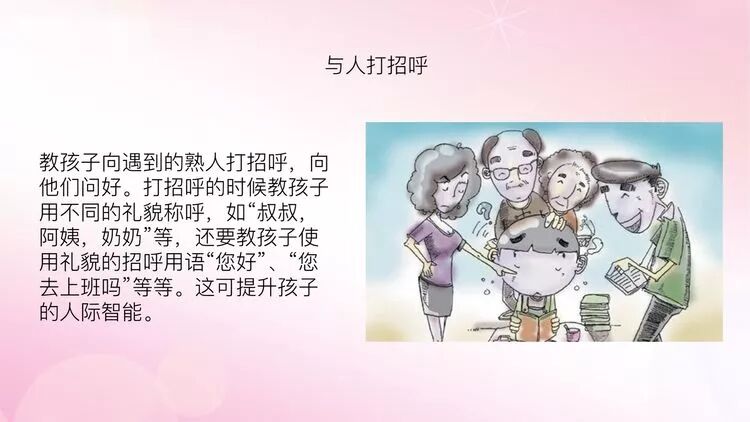 提升宝宝与人交往的能力有非常非常多的一些方法。比如我们看到小朋友跟熟人见面的时候,我们教小朋友遇到的熟人打招向他们问候,我们就教他用礼貌用语称呼,叔叔阿姨奶奶等等,教小朋友用一些问候用语比如你好,你去上班吗,可以提高人际智能的能力。