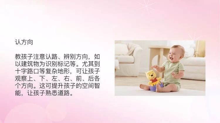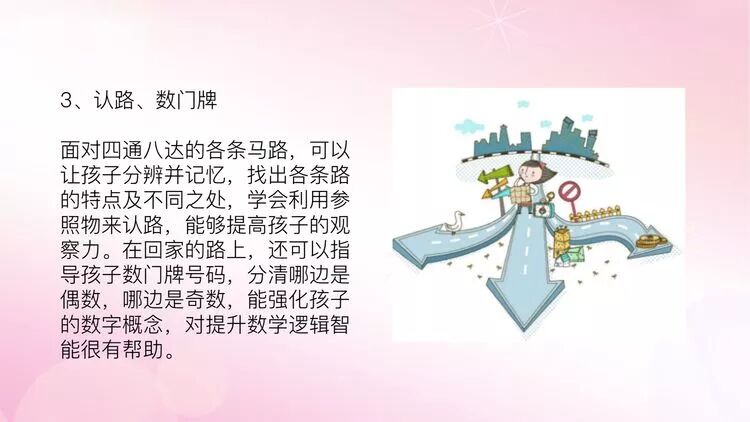 经常会提及到我们是路盲,或者什么什么盲,在这方面我们总想教小朋友认路,注意辨别方向。比如说新到一个地方,教小朋友注意特征性的指标建筑物或者识别标志。十字路口路况比较复杂,可以让小朋友观察上下左右前后各个方向,找出一些标志性的建筑物,这样提升空间智能能力,熟悉周围环境,熟悉道路。