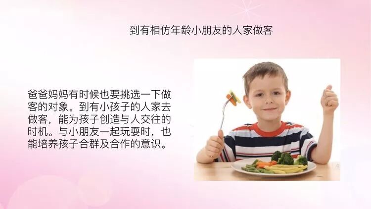 我们在去别人家做客的时候,可以适当的挑选做客的对象,比如说到有相仿年纪的小朋友这个人家里面做客。到这些人家里面做的话可以为小朋友创造与人交往的机会,因为小朋友天地跟我们大人是有很大的不同的。与朋友家里的小朋友一起玩的时候,还培养孩子合群跟合作这方面的意识能力。