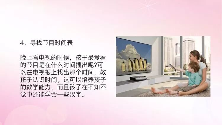 一般的时候,我们都不建议小朋友看太多的电视。但是有些儿童节目,我们可以建议看,比如说晚上看电视的时候,我们就可以问小孩子喜欢的节目是什么时间播出呢,在电视报上找出那个时间。教小孩们就是认识时间的概念,这样就培养到小孩的数学能力。而且小孩在不知不觉中也学会这些汉字,所以通过看电视,可以学到一些东西了。