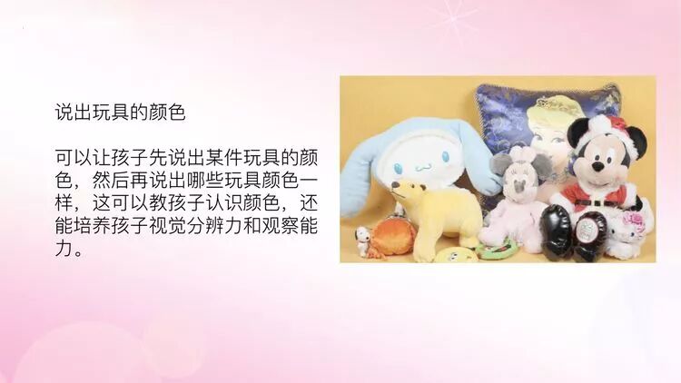 小朋友们都有很多玩具a拿出一种玩具,让小朋友说出某种玩具的颜色,然后找出哪些玩具颜色一样,可以教小朋友认识颜色,也可以培养小朋友的视觉分辨能力跟观察能力。