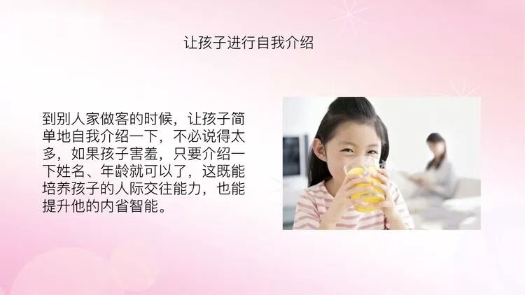 跟别人交往的时候,比如说带小朋友去别人家里做客的时候,可以让小朋友简单的自我介绍,不用说的太多,如果小孩子比较害羞,那我们一般简单介绍一下他的姓名跟年龄就可以了,如果小朋友很落落大方的话,那可以教小朋友说的东西,介绍的东西就多一些。培养孩子的人际交往能力,提高他的内省的智能能力。