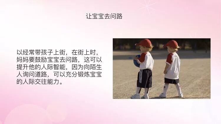 在带小朋友外出的时候,比如说在街上走,我们也可以鼓励小朋友去问路。这一个方面可以提升他的人际智能的能力,向陌生人问路充分锻炼宝宝的人际交往能力,锻炼他的独立性跟创造性等方面。