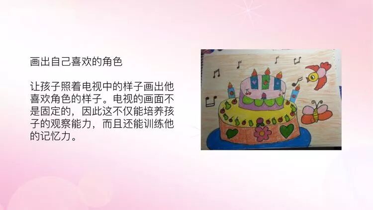 平时在看儿童节目的时候,可以让孩子对照电视中的样子画出他喜欢的人物的样子。电视画面是不固定的,这样我们就可以训练小朋友的记忆力和观察能力。然后我们利用电视回放功能,放到固定的位置,对照他画的人物角色的样子,跟电视上面的实际情况做对比,找出不足,提高他的观察能力和记忆能力。