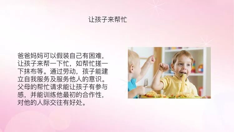 我们也可以设定一些具体的环境,情景来测试小朋友。比如说爸爸妈妈可以假装自己有一些困难,让小朋友来帮一下忙。比如帮忙搓一下抹布等等。通过劳动建立起自我服务跟服务他人的意识,父母的帮忙请求也能让小朋友能够参与,有个参与感,训练他最初的合作性。对他以后的成长,人际交往非常有好处的。