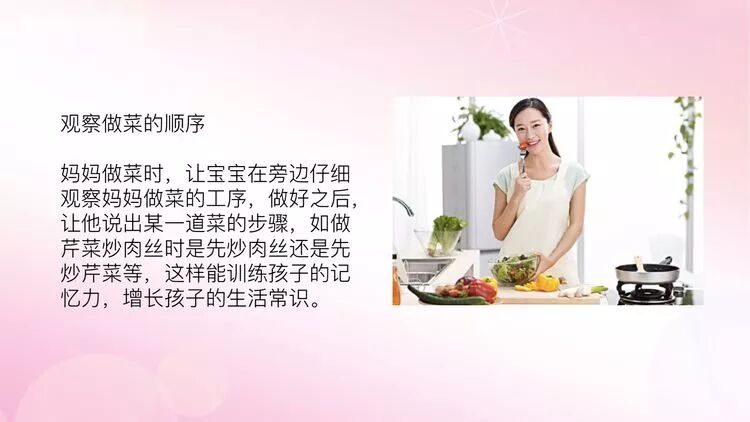 生活中我们可以观察妈妈做菜时候,准备饭菜的时候,让小朋友仔细观察做菜的程序,工具。做好之后,可以让孩子说出某道菜的步骤,比如芹菜炒肉丝啊,麻婆豆腐等等,是先放芹菜还是先放肉丝,这样可以训练孩子的记忆力,增长生活常识,兴趣点等。