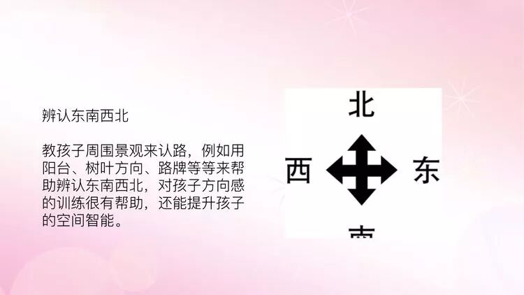 锻炼小朋友空间智能能力方面也可以通过辨认东西南北这方面来提升的。比如说我们教小朋友通过周围的景观来认路。用阳台,树叶方向,路牌等等,在辨认东西南北这方面,对小朋友方向感的训练非常有帮助。