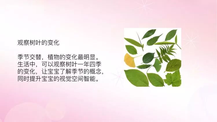 提升宝宝的视觉空间智能能力这方面我们可以通过观察树叶的变化。我们都知道四季的季节的交替,植物的变化最明显的。在生活中我们观察树叶的一年四季的变化也可以充分让宝宝了解具体的季节,及提升宝宝的视觉空间能力。