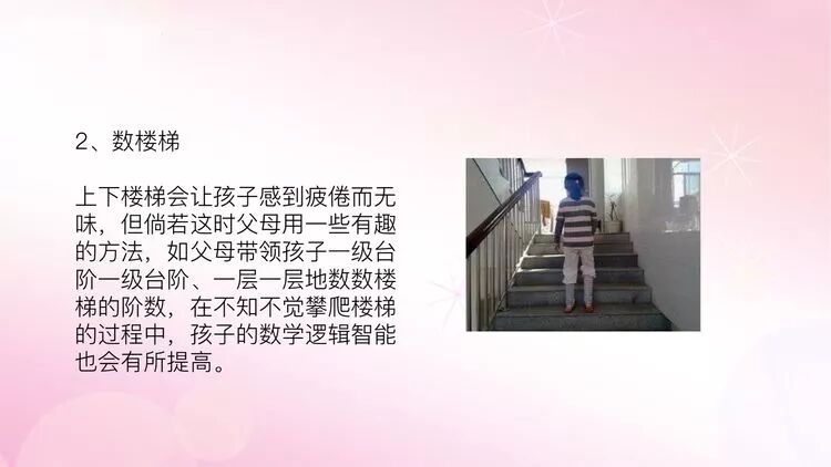 平时生活的活动之中,我们可以训练小朋友的数学逻辑智能能力,比如说我们上下楼梯的时候。多数小朋友都会感到疲倦,要我们大人去抱,那这个时候我们父母可以想一些有趣的方法,比如可以领着小孩子一级一级台阶的走,一层一层的数,我们在不知不觉之中,提高小朋友的逻辑智能能力。