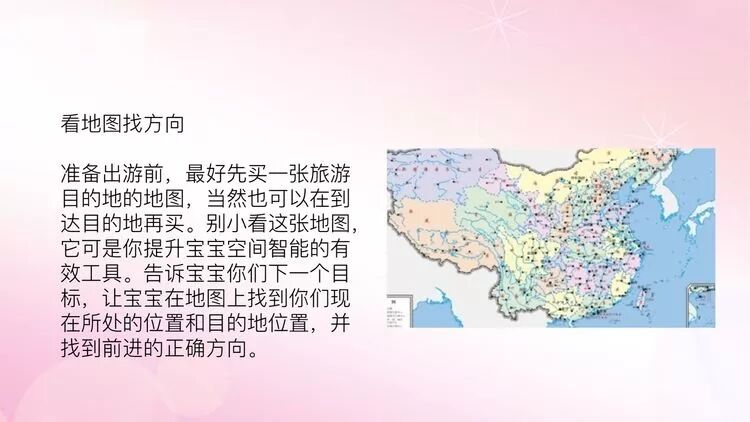 我们准备带孩子出门的时候,我们购买一张旅游地图,到达目的地的时候再买张旅游地图,那这个旅游地图呢,可以在我们到达目的地,告诉小朋友,我们现在所处的位置,告诉小朋友们我们下一个目标,让小朋友在地图上找到我们现在所处的位置跟目的地的位置。那并且找到前进的正确方向,那我们看地图找方向的能力,提高他空间视觉智能。