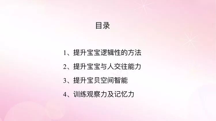 我们讨论的内容包括四个大的方向,第一个如何提升宝贝逻辑性的方法,第二个如何提升宝贝与人交往的能力,第三如何提升宝贝的空间智能能力,第四我们怎么样训练观察力以及记忆力的问题。
