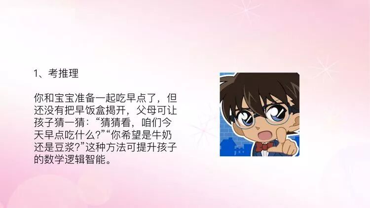 譬如说在日常生活活动中,我们常常可以训练到小朋友的考推理这方面的能力,比如说我们在跟小朋友一起准备吃早点的时候,那在饭盒没有打开的时候呢,我们父母可以让小朋友猜一猜今天早晨吃什么宝贝们,你猜猜看我们今天早上早点吃什么东西呀,那你希望是什么东西呀,是牛奶,还是豆浆等等各方面的问题,那我们可以提升小朋友的数学逻辑智能的能力。