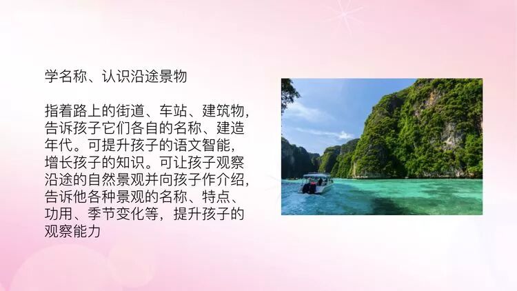 旅游的过程中。我们给小朋友指路上的街道,车站,建筑物,告诉孩子他们各自的名称,建设的年代。这样提升孩子的语言文字能力,增长孩子知识。可以教孩子观察沿途的自然景观,并向孩子介绍各地的情况,名称,特点,功用,季节变化等等内容,可以提高小朋友的观察能力。