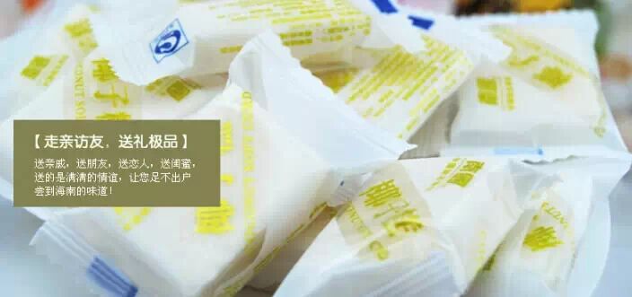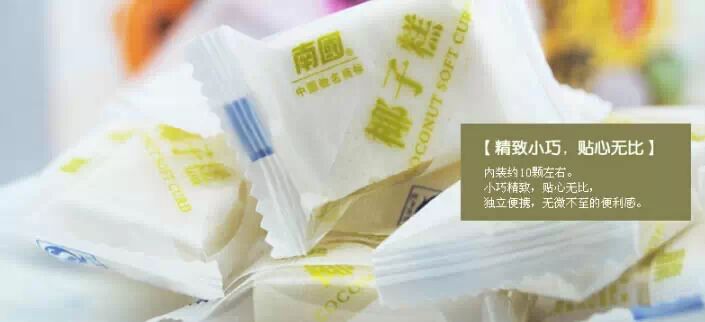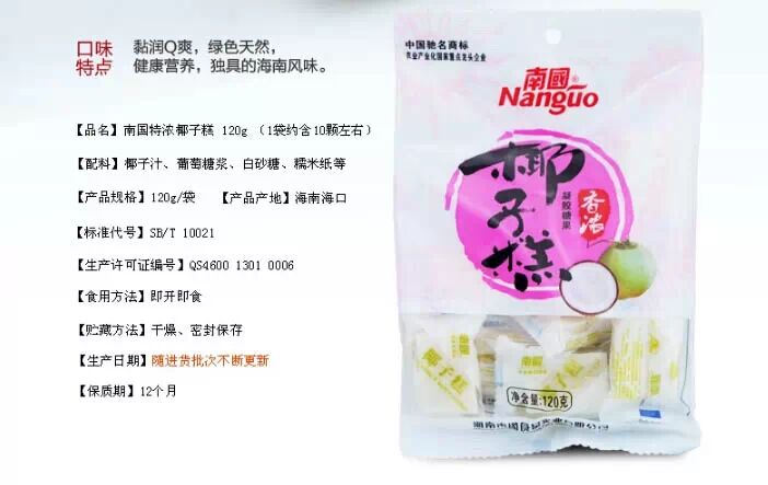 产品介绍:椰子糕是椰子精华的浓缩。椰子糕是由葡萄糖浆、白砂糖、鲜椰子汁、糯米纸原料精制而成。椰子糕除了具有年糕的绵软特点外,其超Q是最大的特色,甜而不腻中夹着一丝丝韧劲,软软的、绵绵的,外观上南国椰子糕色泽明,光滑洁亮,赏心悦目,诱人食欲,入口清爽,甜滑润喉。 特点:椰香浓郁、软糯可口、馅料香甜。