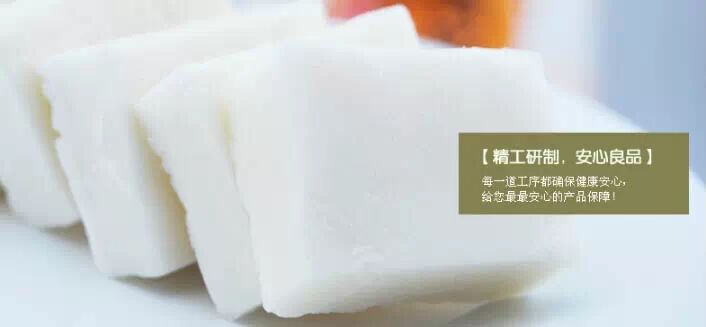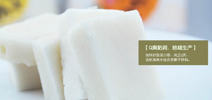 本产品选用新鲜红椰子及葡萄糖为原料,采用先进工艺,精制而成,绝不添加任何色素、香精及防腐剂!且最大程度地保留了椰子的原汁原味及营养成份。椰子糕富含大量易于人体吸收的植物蛋白,膳食纤维、维生素和矿物质,果香浓郁,细腻爽口,Q劲十足,香气馥郁,吃后口留椰香,令人回味无穷。