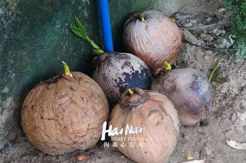 发芽后的老椰子,我们叫做长角椰,坚硬的椰子壳上长出小小的嫩芽,如果太老的话,椰子里面就没有椰子水了,但是会有一个更加珍贵的东西,就是椰子饼,有些地方也叫做椰子蕊。椰子饼像泡沫一样,绵绵地,甜甜地,吃起来别有一番风味。街头的椰子摊上很少有长角的椰子,运气好的话在海南的村子里可能会遇到,在椰子中也是一种可遇而不可求的珍品了。