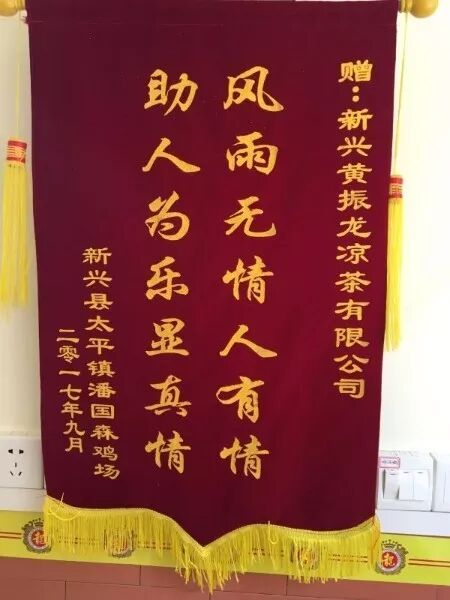 不知道大家还记得今年8月尾旬新兴连续受到“天鸽”和“帕卡”两场天灾的影响吗?那时候位于共成镇的一户养殖场被淹没,场内所养的鸡死伤无数,后来黄振龙的陈经理看到此消息自愿捐助!之后场主为表感谢,刚好在第五分店开业的时候送来锦旗,为开业增添一份温暖和喜庆!