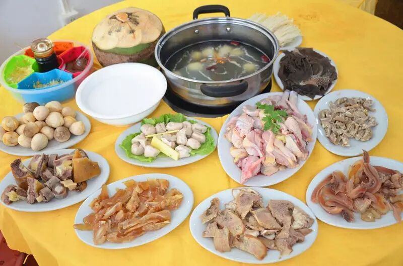 (海南椰王汤底 + 正宗海南文昌鸡(半只)+ 正宗汕头牛肉丸拼鱼丸、鱼饺 + 肥牛 + 牛肚 + 秘制牛杂煲 + 粉/面 + 腐竹 + 鲜采草菇 + 豆腐 + 青菜 + 萝卜 + 芹菜粒 + 沙茶酱 + 辣椒酱 + 辣椒圈 + 姜汁 + 野生金桔 + 茶位6)原价¥329,折后价¥178