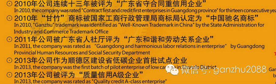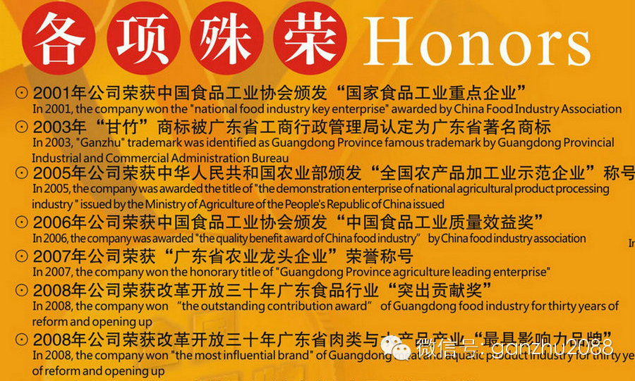 广东甘竹罐头有限公司荣获“广东省农业龙头企业”、“佛山市纳税超3000万企业”、“连续十三年守合同重信用企业”等荣誉称号,“甘竹”商标被评为“广东省著名商标”“中国驰名商标”。