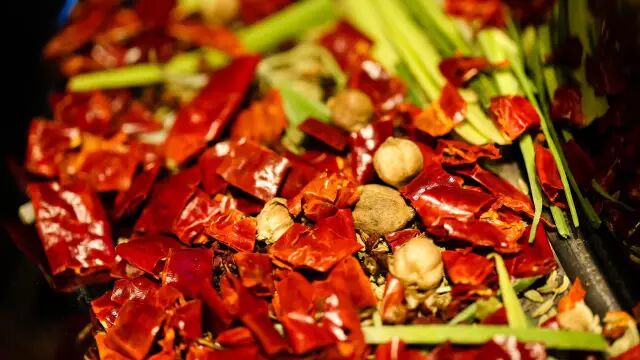 锅内的底料分明,辣锅中是各种辣椒麻椒和香料