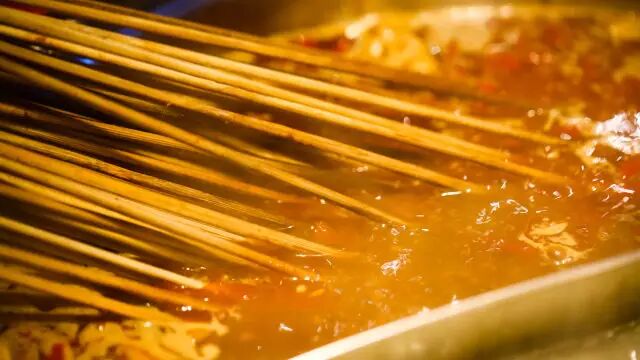 串串们码放整齐的入了锅,红油滚动间,周围已经是香味四溢。