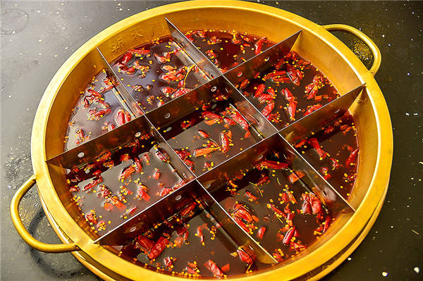 传统感十足的火锅以及可拆卸的九宫格,立刻增加了重庆火锅的气氛和味道。浓郁的牛油汤底以及铺满的朝天椒,看着就让人觉得口水四溢。