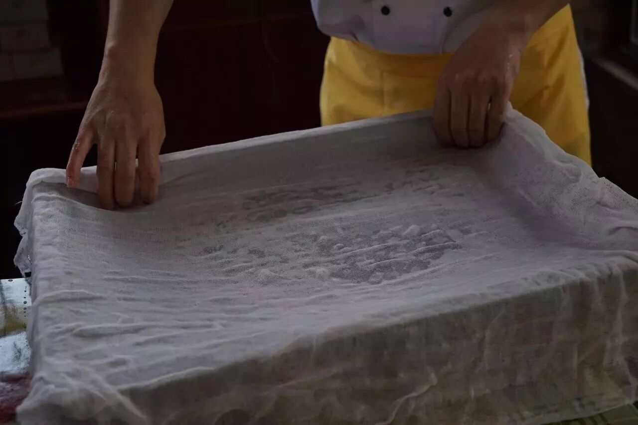 第五步:取糕屉,平铺清洁的湿布,放入一半的糕粉抹平;
