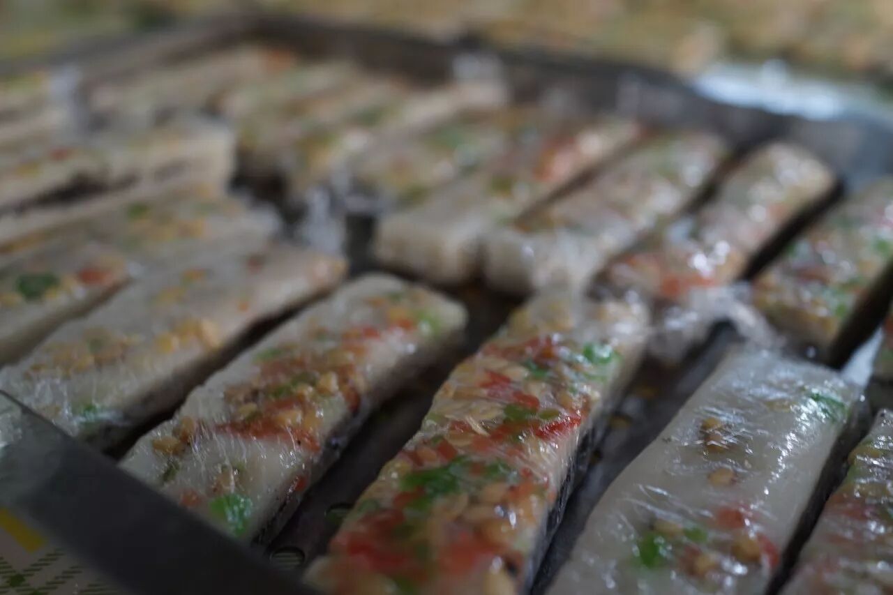 第九步:将蒸熟的糕取出,用刀切成块,漂亮美味的重阳糕就做好了。