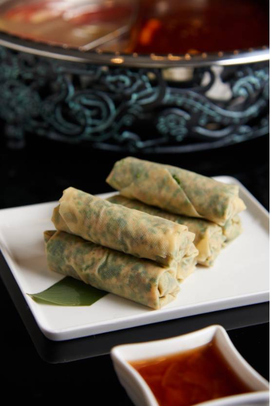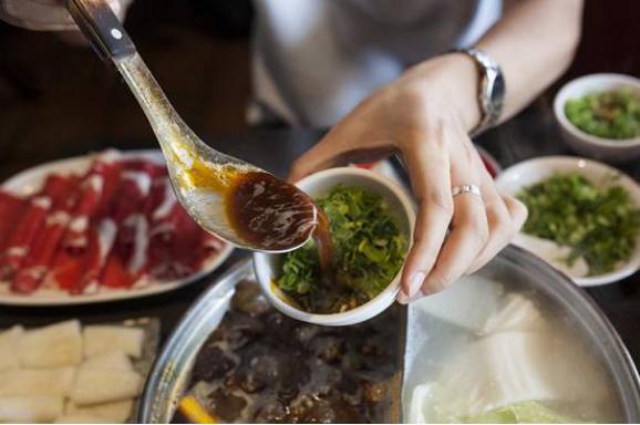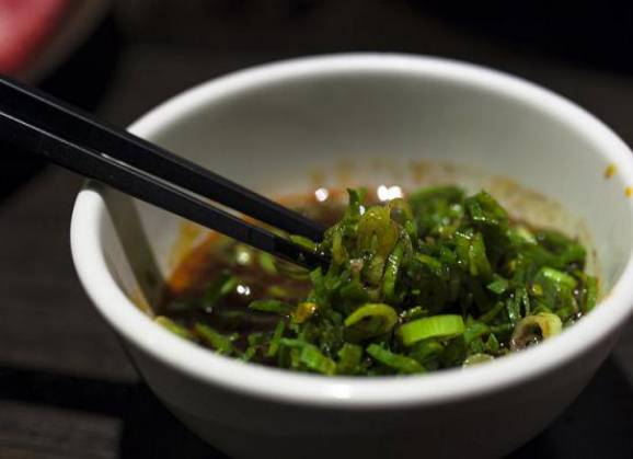 ▲沾料是纯粹运用麻辣汤底加热後,用滚热的麻辣汤冲出新鲜蒜苗的香气做成,最后再将涮熟了的菜肴包裹者蒜苗一起食用。