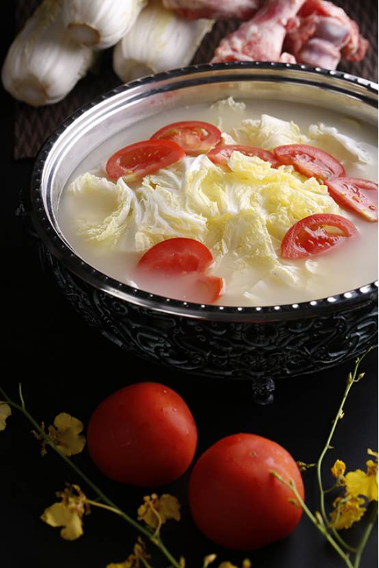 够香够入味的麻辣牛骨汤用来涮肉才过瘾,猪骨精炖出来的白汤配素菜则再合适不过,哪怕只是最简单的白菜、西红柿,满满的骨胶原蛋白和扩散到每个细胞的鲜美都让人忍不住喝上三大碗!