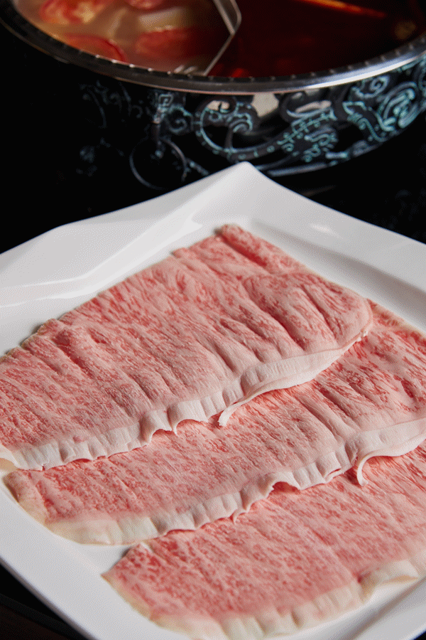 松阪级牛肉光看那肥瘦相间、无比匀称如大理石般的纹理,就让人按耐不住。这一大片下锅涮烫个三两下後,把蘸上了满满麻辣汤的肉片从汤中捞出来品味,那一大口送入嘴中满满地肉香四溢,简直是人生最幸福快乐的事。