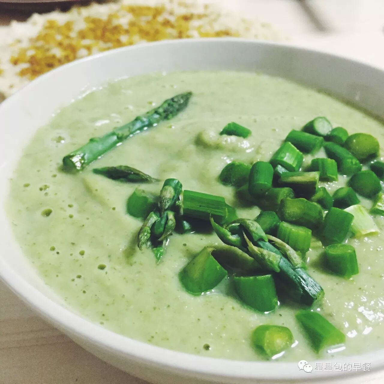 汤室友都说好喝!里面有西兰花,西葫芦,百里香,罗勒,黑胡椒,红胡椒,盐~芦笋是炒了之后放在汤上面做点缀哒!