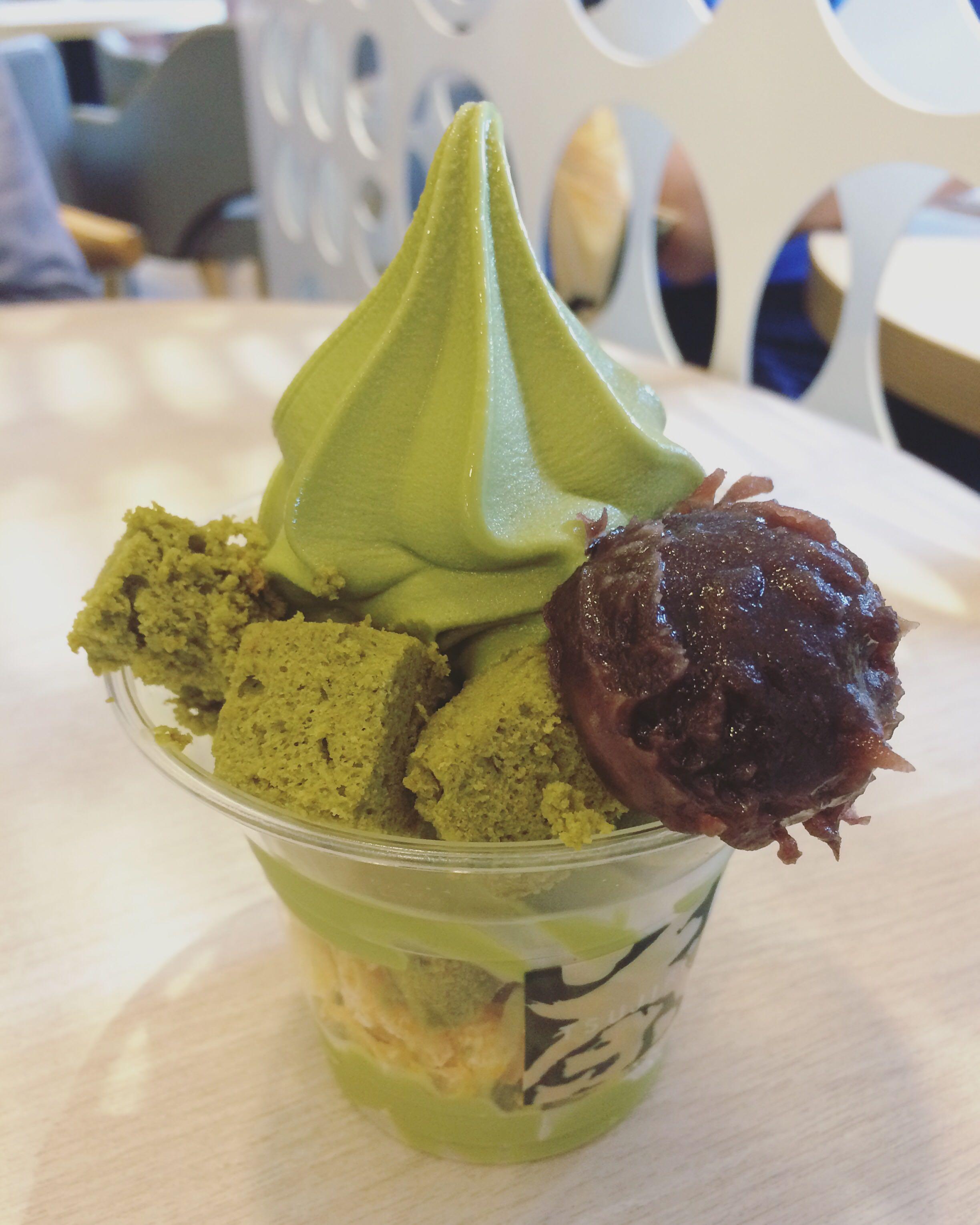 老板似乎是个日本人来着,生意还挺好的。选了他家的特色,抹茶白玉红豆至尊,超大一杯,最底下是绿色的像抹茶果冻一样的东西。中间是淡奶油芝士豆沙,有两个糯米小丸子,上面是清爽的抹茶冰淇淋。本来以为中间那层奶油会腻死人,结果完全没有。虽然甜但是入口即化。