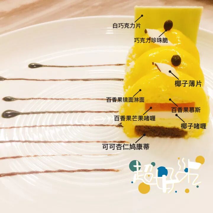 这是蓝带学院的教程中,永远不变的经典。白巧克力片搭以巧克力珍珠脆,用椰子薄片点缀,配以百香果镜面淋面、百香果慕斯、百香果芒果啫喱、椰子啫喱,加之可可杏仁鸠康蒂,用料十足。