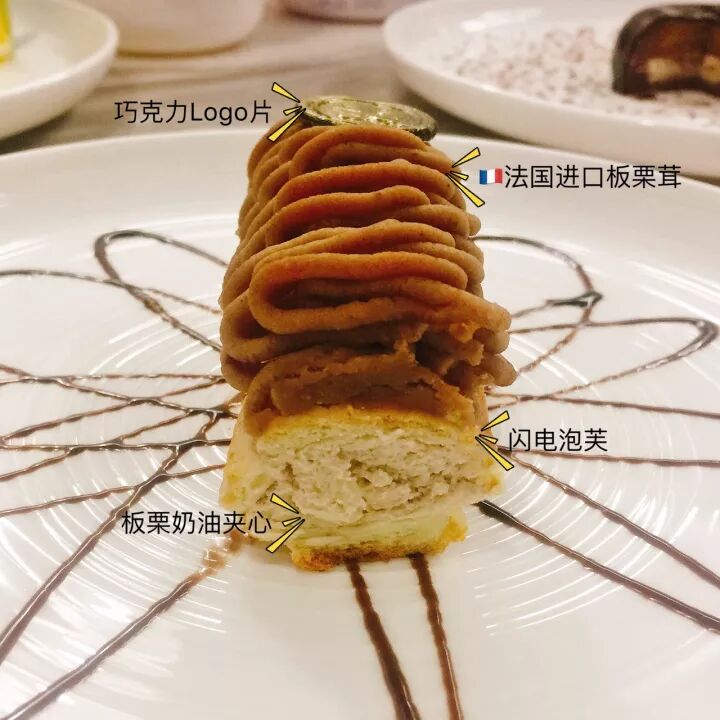 蒙布朗闪电泡芙包含了法国进口板栗茸、板栗奶油夹心,以及巧克力logo片予以点缀,精致的外形已经让外貌控心动不已。