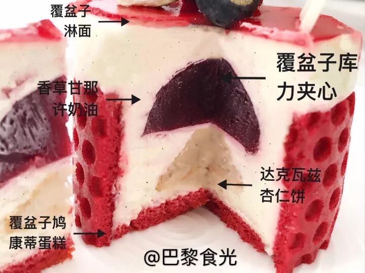 整个蛋糕由内而外依次为达克瓦兹杏仁饼、覆盆子库利夹心、香草甘纳许奶油、以覆盆子邻面,用覆盆子鸠康蒂蛋糕包装。整体看起来,感到到的就是热情似火的巴比伦。