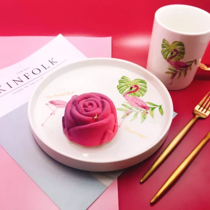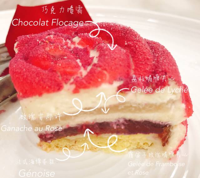 在这款蛋糕里,你能看到的是火红的玫瑰甘纳许和法式海绵蛋糕,而里面藏起来的荔枝啫喱夹心和覆盆子玫瑰啫喱夹心才是味道的王牌,搭配巧克力喷霜让你欲罢不能。