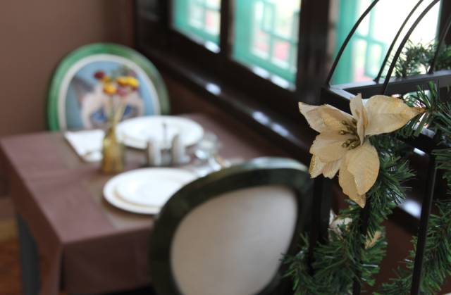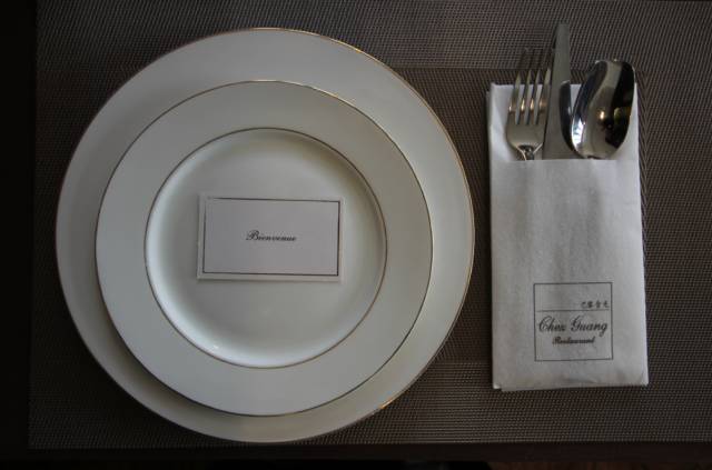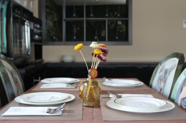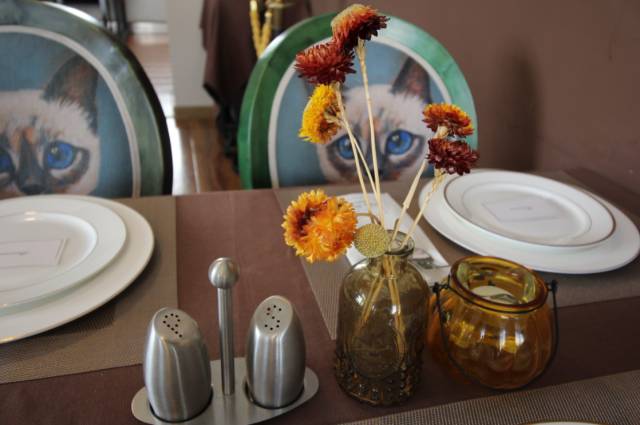柔和的月白瓷餐具于明亮的不锈钢餐具,整洁的餐桌,俏皮的插花,融合在一起漂亮又和谐。这样的环境,很法国。