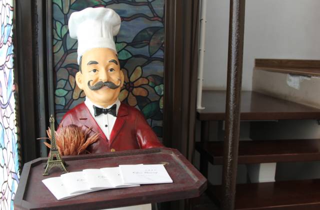 踩在木质的楼梯上,左侧贴花的彩色玻璃体现了欧式风格。,一个欧式大厨立偶迎接着食客,端的托盘上放着餐厅的介绍小册子。