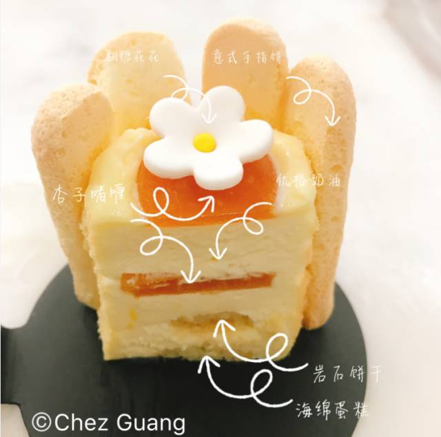 海绵蛋糕搭配岩石饼干,内含优格奶油和杏子啫喱,以翻糖花花作为点缀是精妙之处,搭配意式手指饼更是匠心独具。