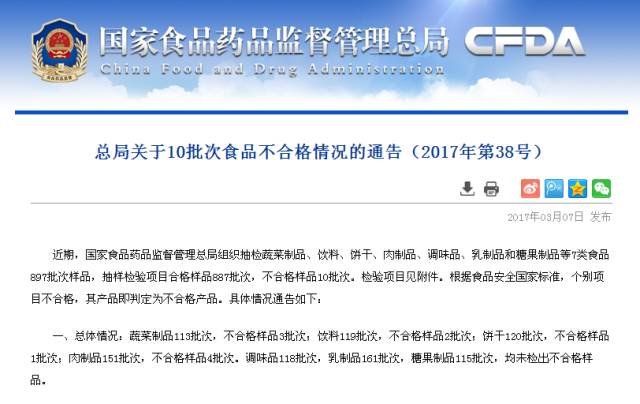 ,、饮料、饼干、肉制品、调味品、乳制品、糖果制品共7类食品897批次样品,发现10批次不合格样品。