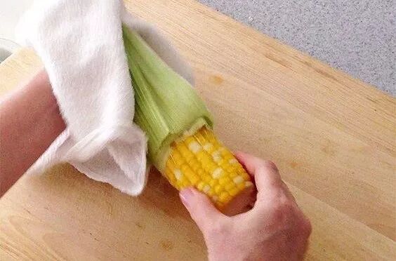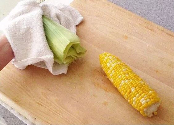 再用一条毛巾包裹住玉米叶,另一只手反向拉扯玉米棒。