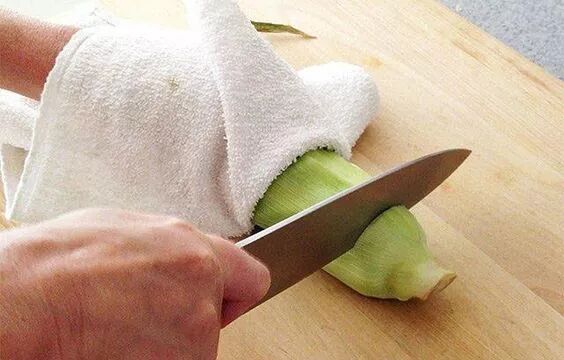 然后取出加热好的玉米,用刀切下玉米根部的一小块。